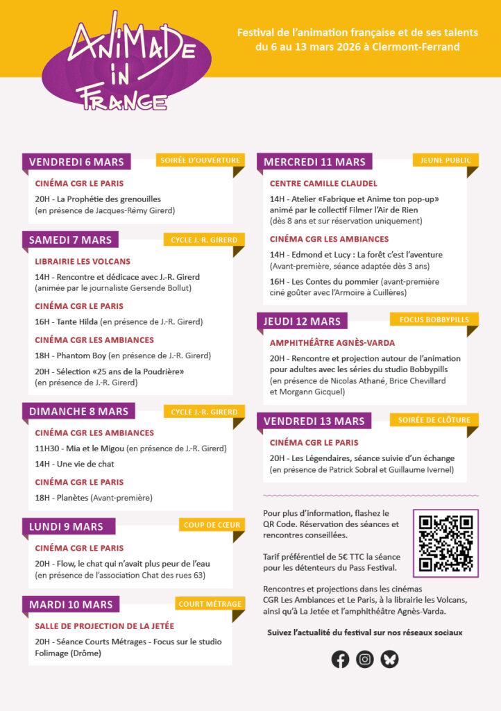 Profitez de la 3e édition du festival Animade in France, du 6 au 13 mars 2026 à Clermont-Ferrand, grâce au Pass Festival ! Il vous donne accès à des tarifs préférentiels, à des séances spéciales, et contribue au soutien du festival. (Tarif réduit à 5€ pour toutes les projections cinéma dans le cadre du festival, entrées gratuites pour la soirée court métrage et la soirée événement avec le studio Bobbypills…). Pour en savoir plus sur le Pass festival.